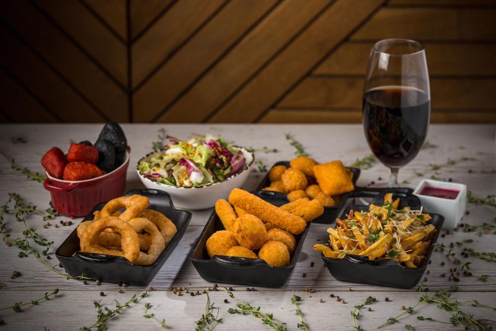 4x mozzarella sticks, 4x jalapeno snacks, 4x philadelphia snacks, 4x black bites, 4x red bites, 4x gouda snacks, 6x onion rings + 400 g french fries with parmesan and garlic + sauce + soft drink